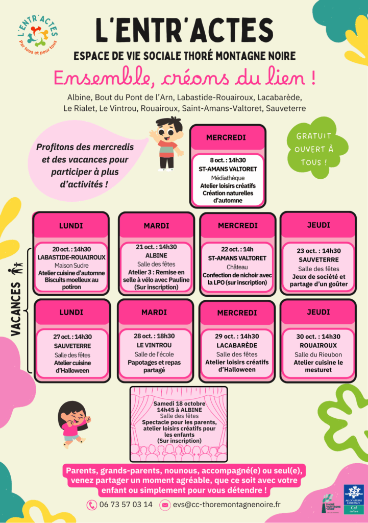 L’Entr’Actes, espace de vie sociale itinérant de la Communauté de communes Thoré Montagne Noire, propose tout un programme pour les parents et les enfants pendant les vacances d’automne ! Pour […]